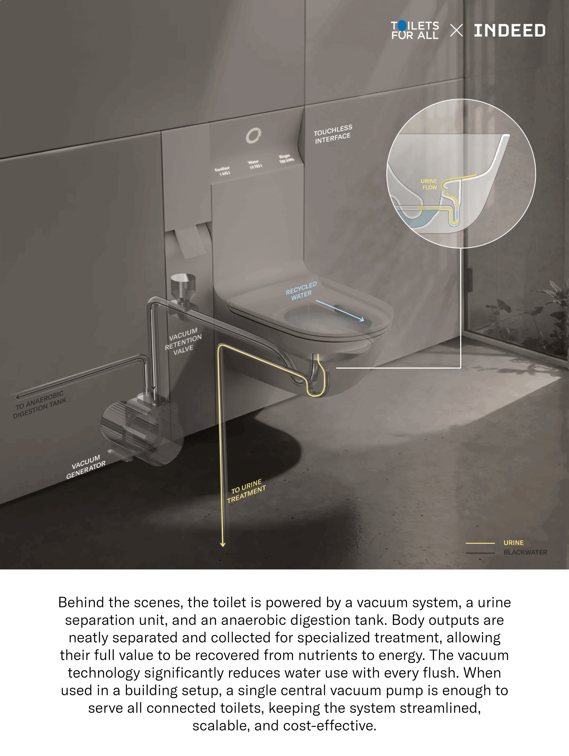At the front end, toilets apply the teapot effect, a clever hydrodynamic principle, to separate urine without changing the look or feel. At the back end, an urine nutrient recovery system transforms it into a safe, effective urine fertilizer.