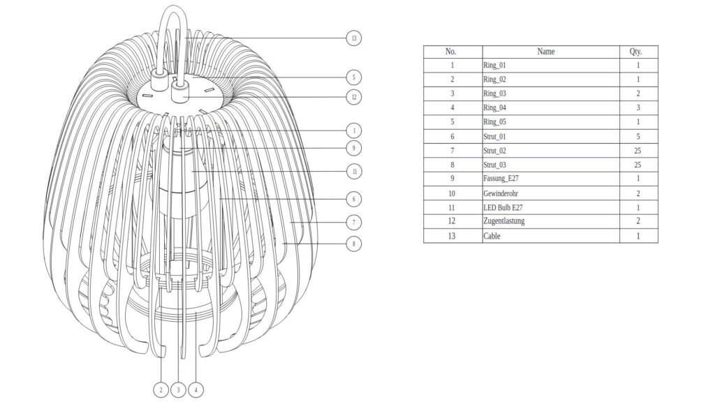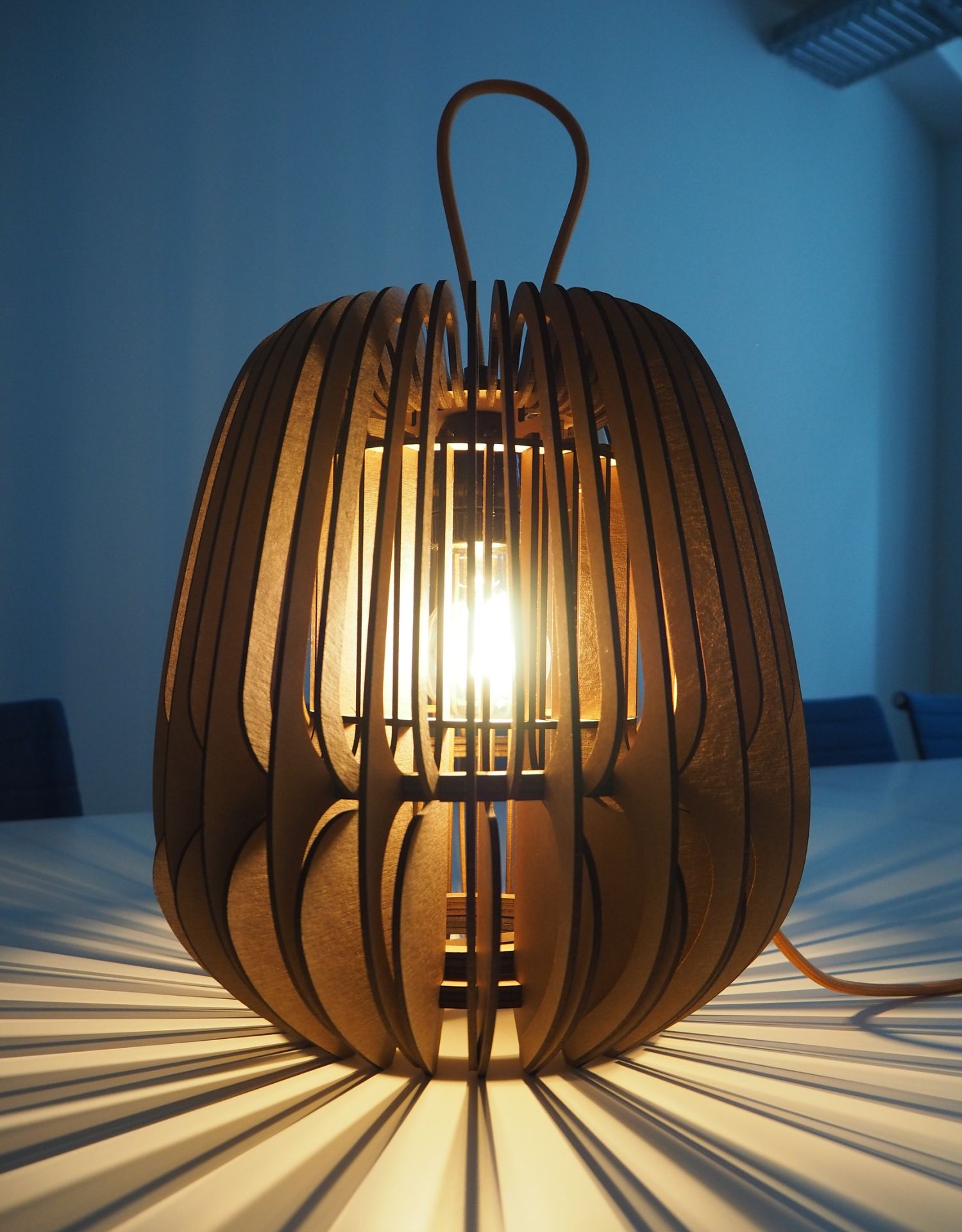 Diversity is also key when it comes to the materials: If desired, the slats can be made from a wide variety of panel materials using a laser cutter or table milling machine. Recycled precious plastic, plywood, acrylic glass, or a wide variety of cardboard are ideal. Due to the parametric of the 3D data, the corresponding material thickness can be easily set via a digital interface. The dimensions of the lamp (diameter and height) as well as the number of slats can be adjusted in the same way, which opens a wide scope for individualization.