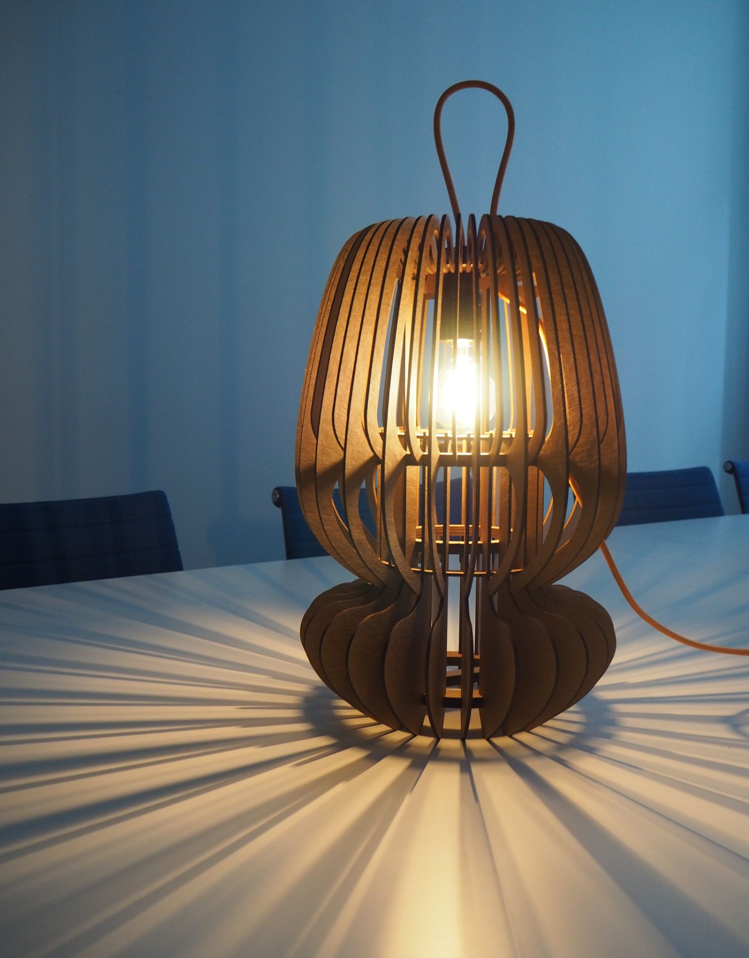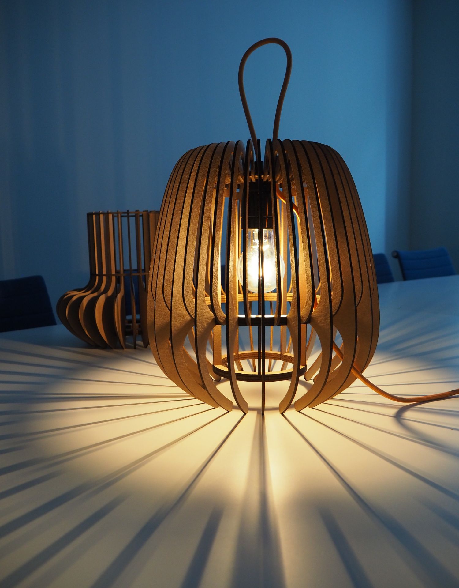 Since the slats are plugged into each other without gluing, any repairs to individual parts are quick and easy. The style of the lamp and the light output can also be adjusted at any time, for example, by replacing some wooden slats with acrylic glass slats—a completely different play of light is created! New trends and change requests can be integrated without buying a new product.