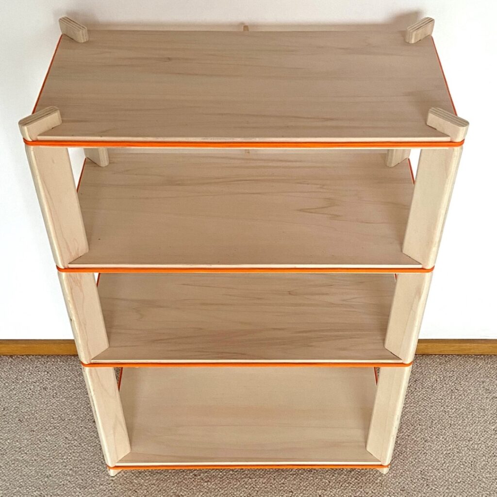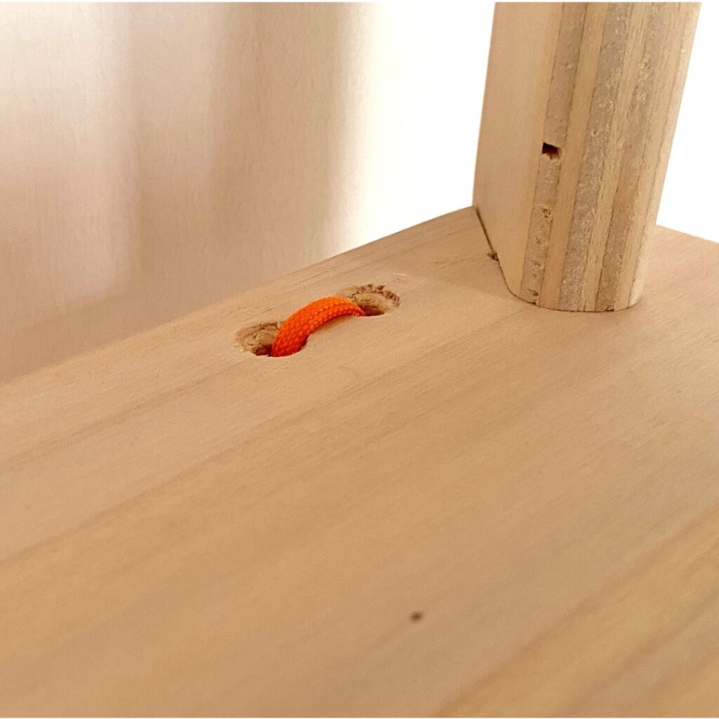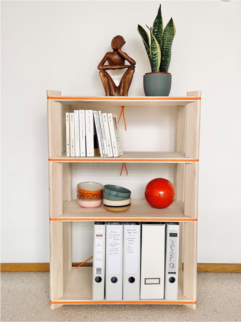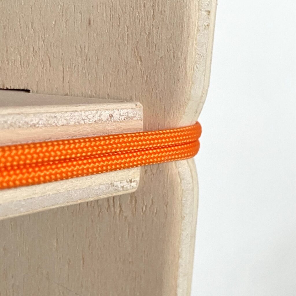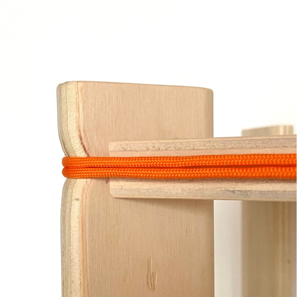 No metal parts are required to assemble the shelf. All components are held together by cords, which generate the necessary tension through twisting to give the construction stability. The cord is not just a design feature for which many variants are conceivable, from brightly colored nylon rope to subtle hemp rope. The crosswise bracing on the back makes it possible to compensate for uneven floors by tensioning at different levels.